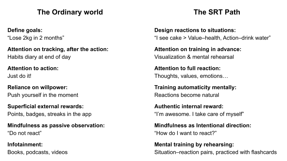 Spaced repetition of your wished Reactions prime you for the Reactions you want to have in real life.